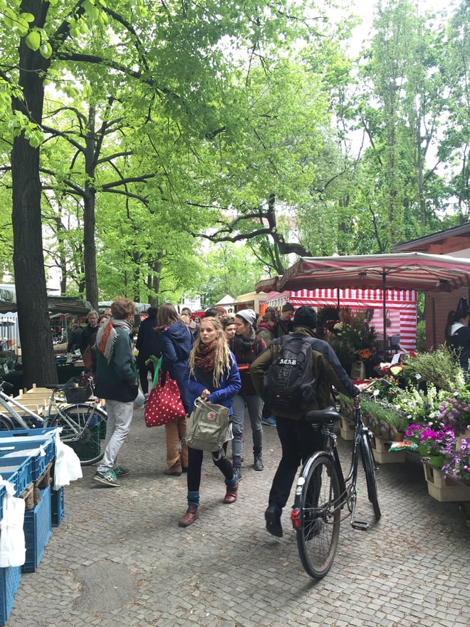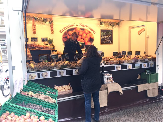 通りで見かけたマーケット。新鮮な野菜がとっても安いんです。ドイツは日本より生活費がかからないのも魅力だそう。